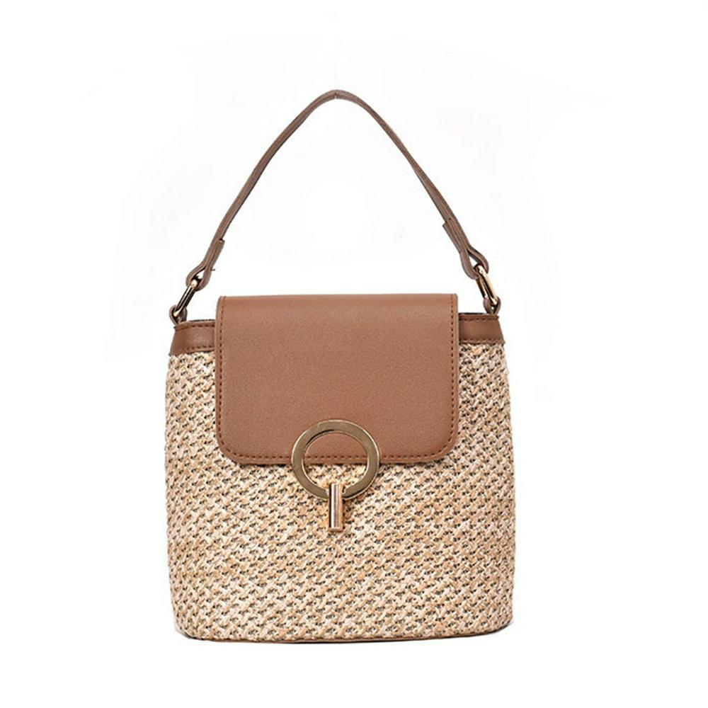 Women's Bohemian Straw-woven Handbag Casual Messenger Bag with PU Leather Flap