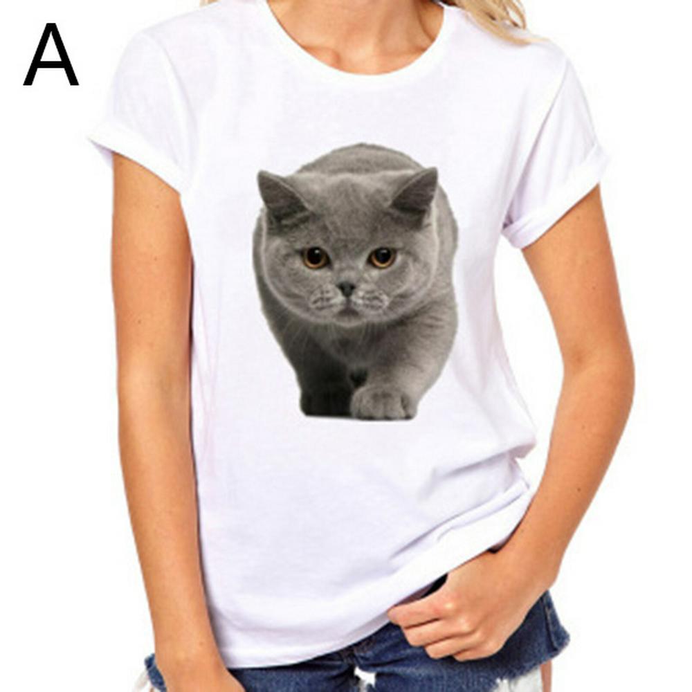 Women's Casual Crewneck T-shrit Printed with Picture of Fat Furry Cat