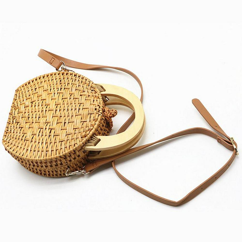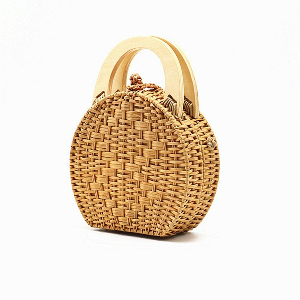Women's Delicate Handbag Rattan Body and Wood Arc Handle and Thin Shoulder Strap