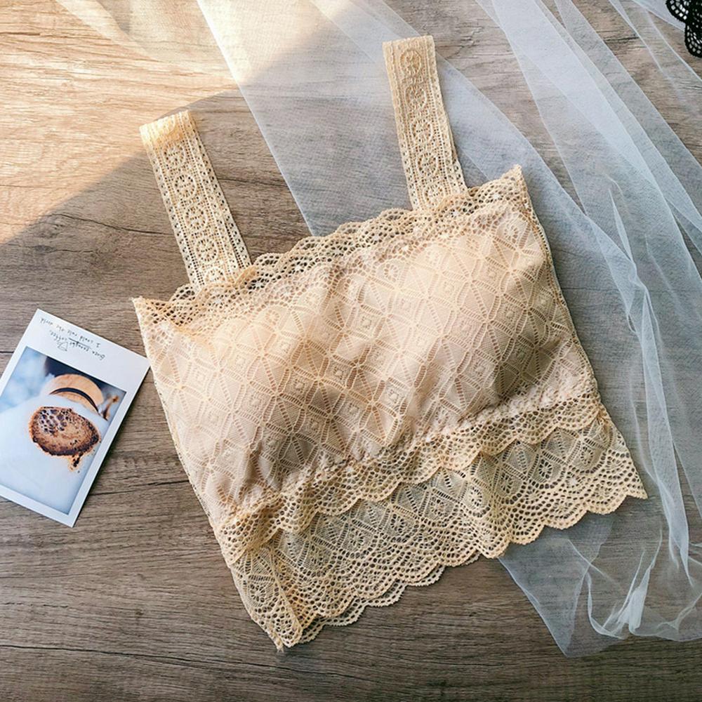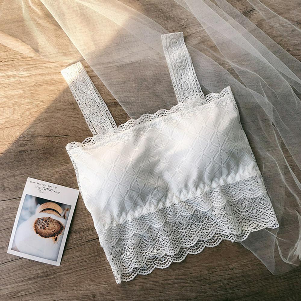 Women's Padded Lace Bra Breathable Bandeau Bra with See-through Ruffle