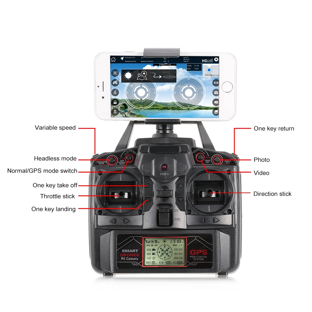Wifi control to realize real-time transmission for live video by pairing the mobile app to the drone wifi. Mobile phones with IOS or Android system are available.