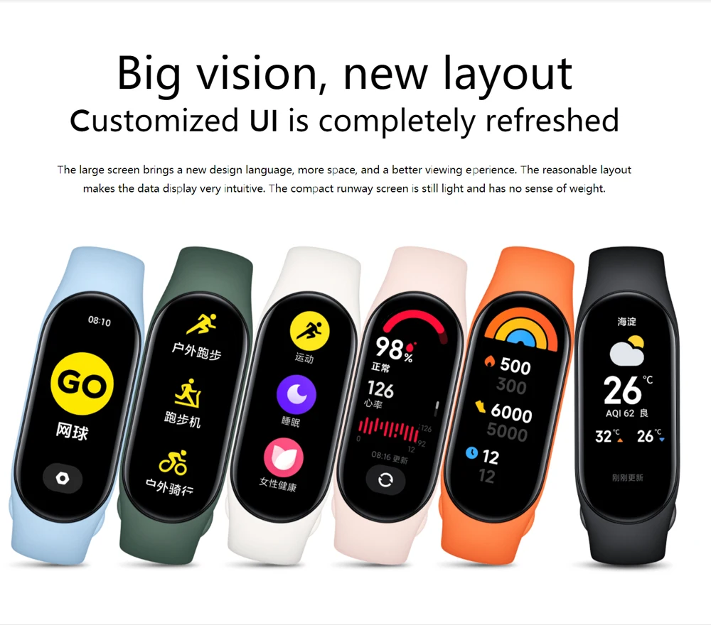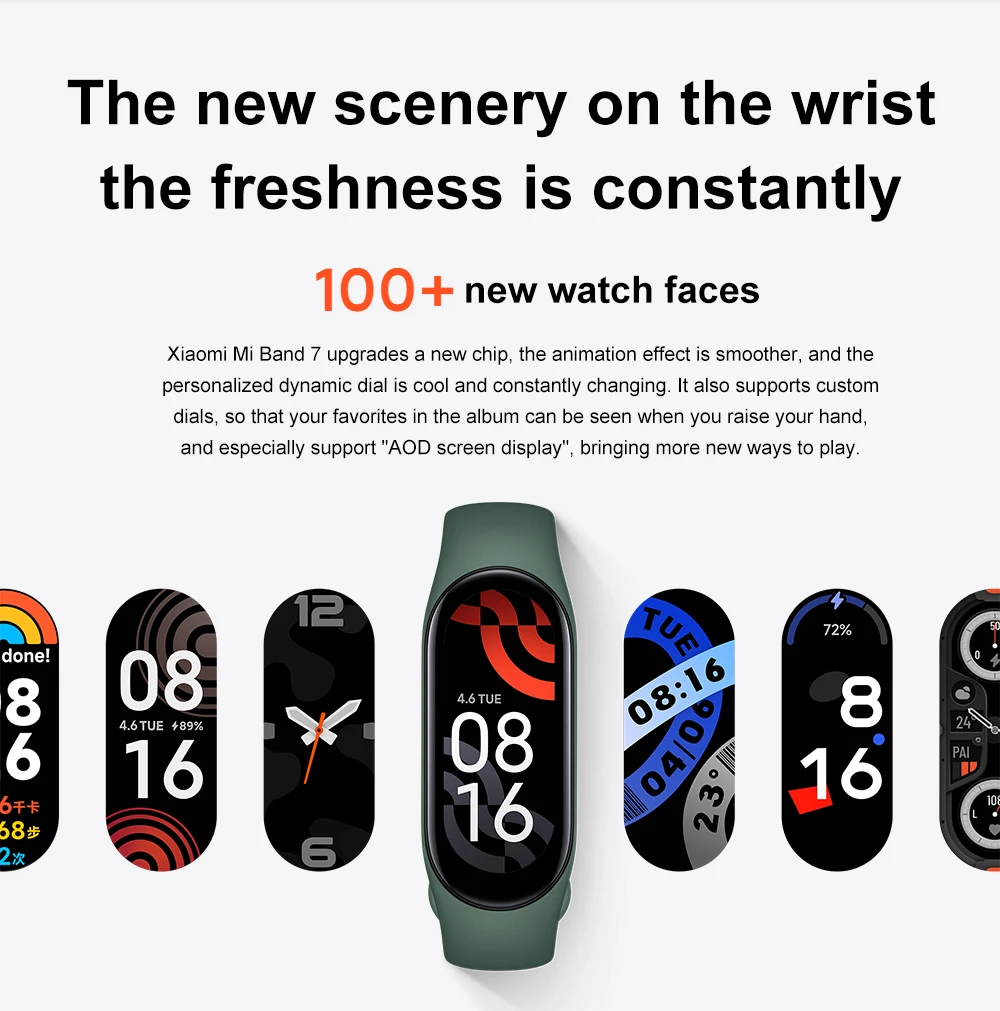 Xiaomi Mi Band 7 upgrades een nieuwe chip, de animatie effect is gladder, en de gepersonaliseerde dynamische wijzerplaat is cool en voortdurend veranderende. Het ondersteunt ook custom wijzerplaten, zodat uw favorieten in de album kan worden gezien wanneer u verhogen uw hand, en vooral ondersteuning "AOD scherm", brengen meer nieuwe manieren om te spelen.