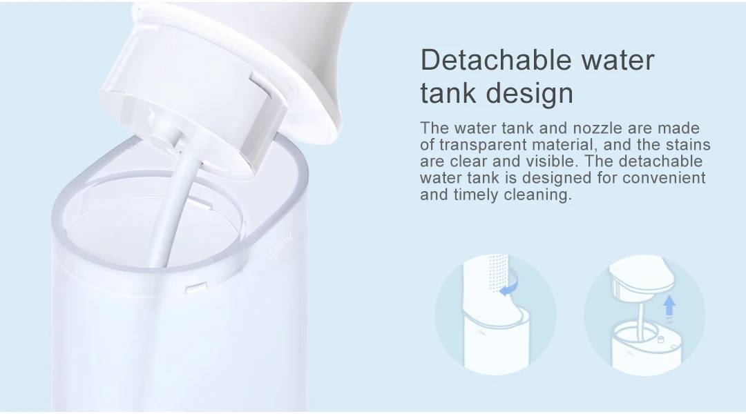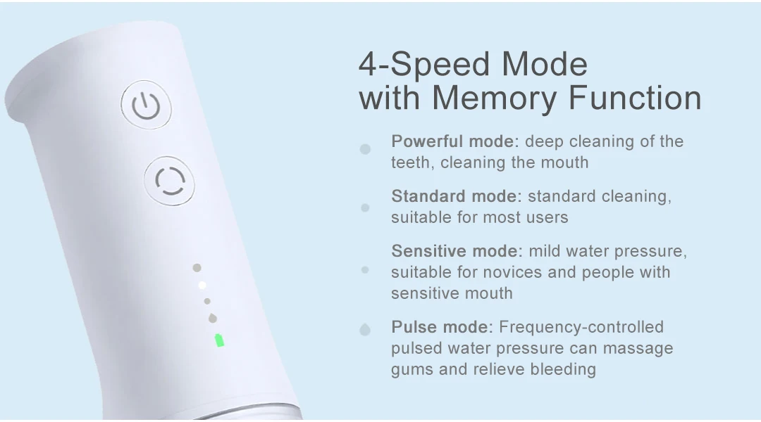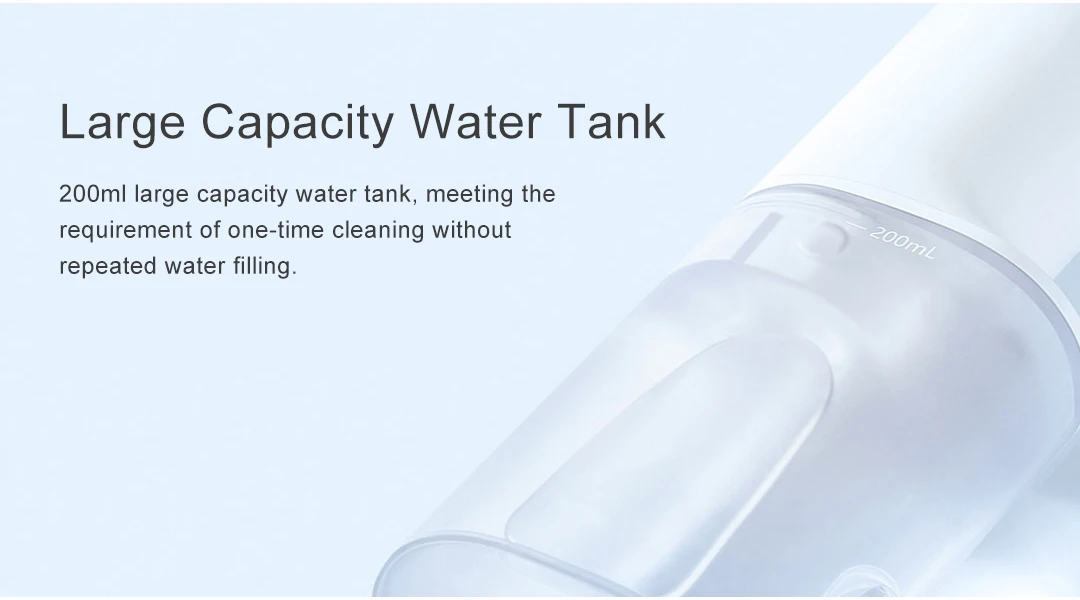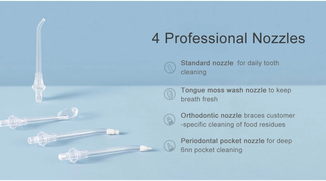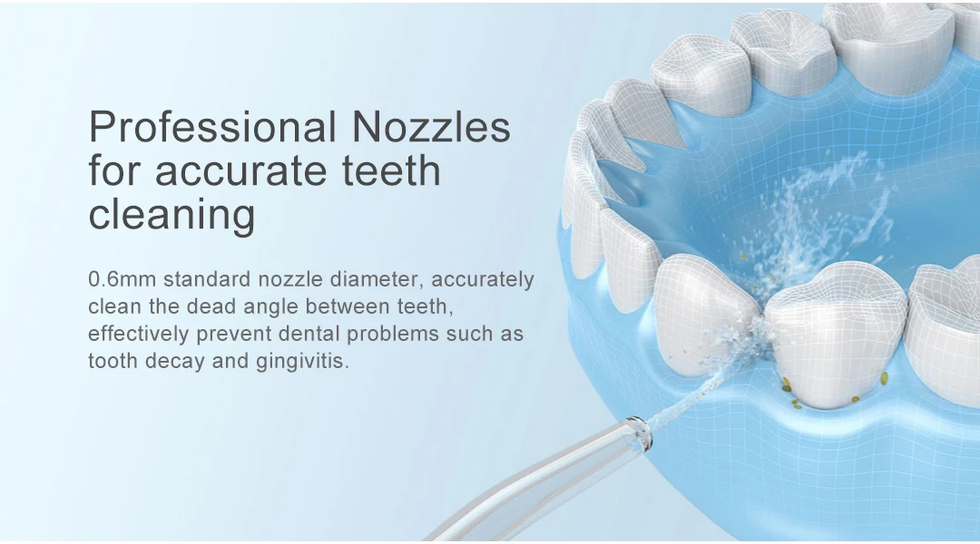 Mijia electric tooth punch is equipped with a new type of carbon brush intelligent permanent magnet motor, with 0.6mm standard nozzle diameter, and the140PSI water pressure, can produce 1400 times/min high frequency pulse water column, quickly wash away food residue.In addition, the dental punch is equipped with four kinds of professional nozzles: daily, orthodontic, tongue coating cleaning and periodontal pocket. What's more, it also supports four different modes: strong mode, standard mode, sensitive mode and pulse mode, which can meet different oral cleaning needs.