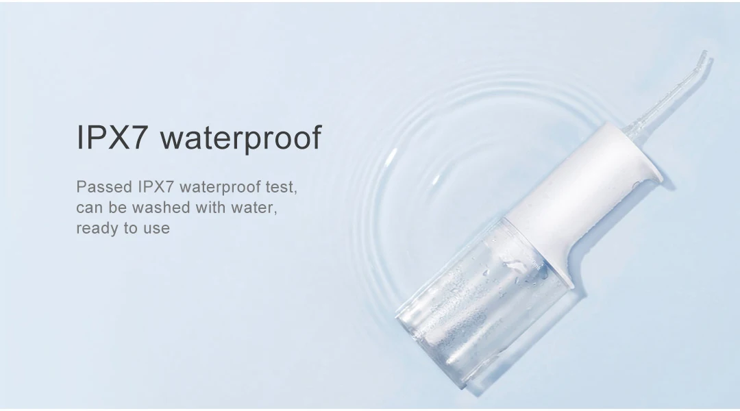 Brand:XIAOMI Mijia Mode:MEO701 Color:White Parameter:Rated voltage 3.7V Rated input 5V = 1A Rated power 12W Waterproof:IPX7 Charging time :4 hours Implementation standards:GB 4706.1-2005 GB 4706.59-2008 Size:70.0 X 47.0 x 207.0mm Package Contents Water tank x 1 Body x 1 Standard nozzle xl Orthodontic nozzle x 1 Periodontal pocket nozzle x 1 Tongue cleaning nozzle x 1 Type-C charging cable x 1 Nozzle storage box x 1 Manual x 1