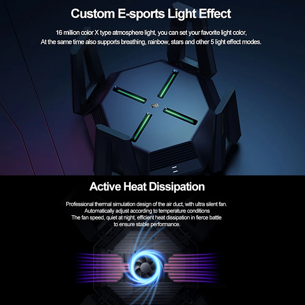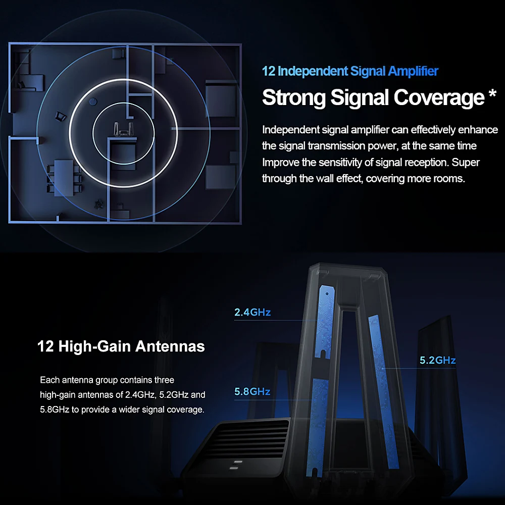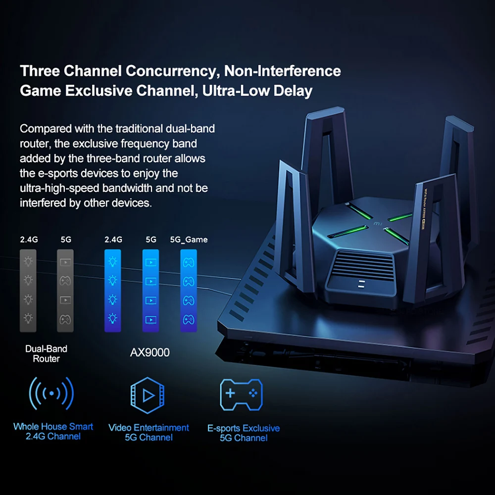 -2.4GHz+5GHz+5GHz-Gamethree-band router allows the e-sports to enjoy the ultra-high-speed bandwidth and not be interfered by other devices.