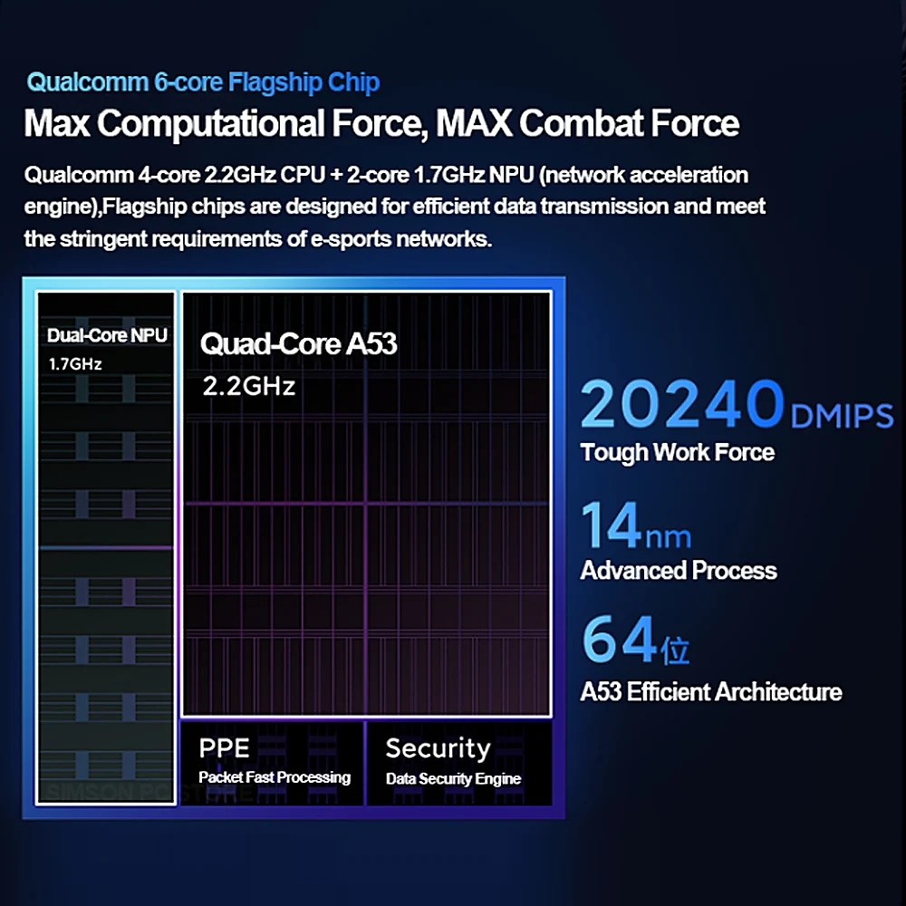 - Comes with QualcommQuad-core2.2 GHz CPU + 2-core 1.7GHz NPU(Network acceleration engine).