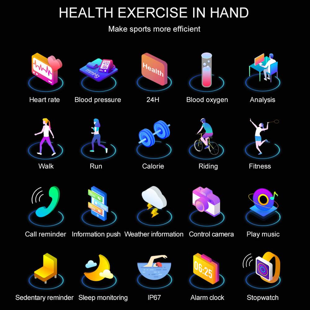 Health monitoring:Real-time heart rate measurement (dynamic,static,heart rate +),blood pressure measurement (can set timing blood pressure measurement),blood oxygen measurement,fatigue monitoring.