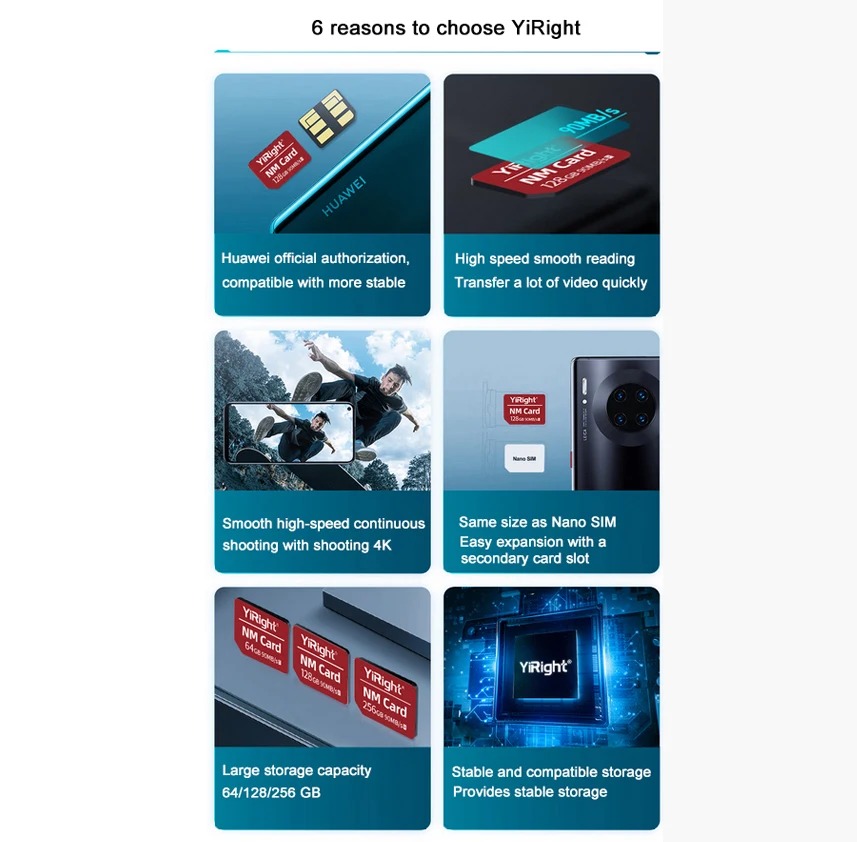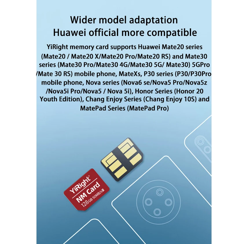 YiRight memory card supports Huawei Mate20 series(Mate20/Mate20 x/Mate20 Pro/Mate20RS) and Mate30 series(Mate30 Pro/Mate30 4G/Mate30 5G/Mate30)5G Pro/Mate 30RS)mobile phone,MateXS,P30/P30Pro mobile phone,Nova series(Nova6 se/Nova5 Pro/Nova5z/Nova5i Pro/Nova5/Nova 5i),Honor Series(Honor 20 Youth Edition),Chang Enjoy Series(Chang Enjoy 10S)and MatePad Series(MatePad Pro)