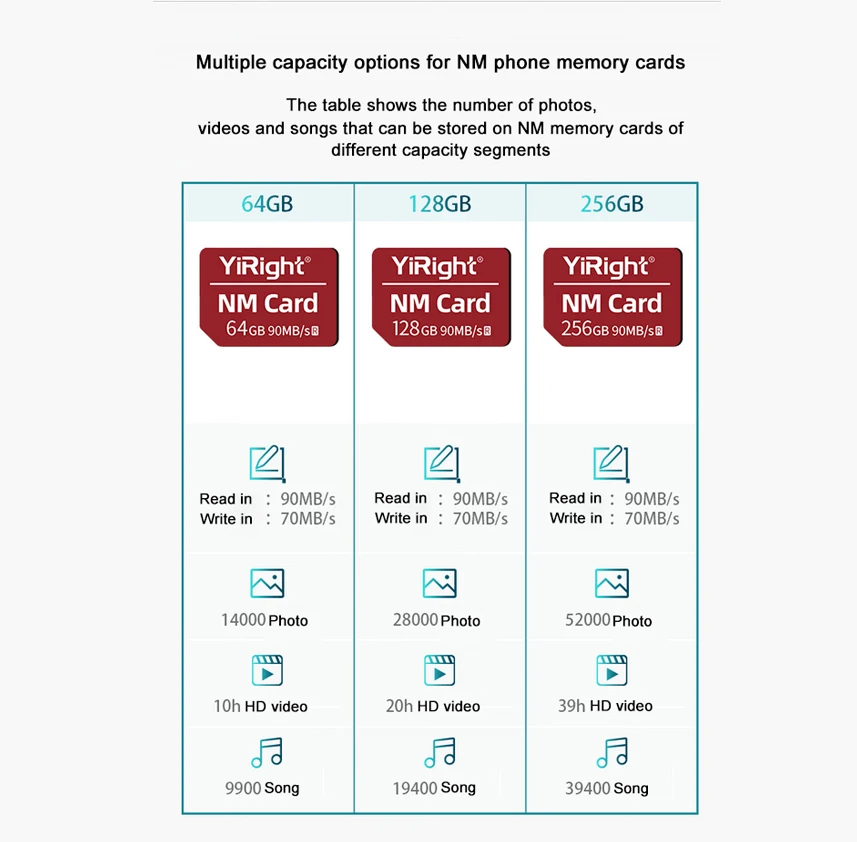 The table shows the number of photos,videos and songs that can be stored on NM memory cards of different capacity segments