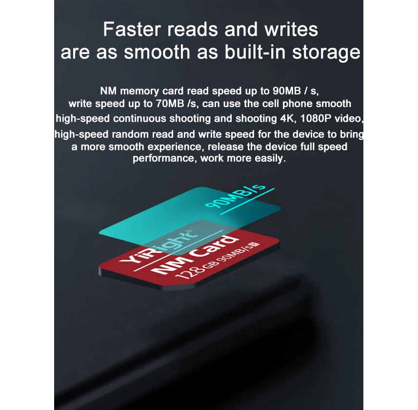 NM memory card read speed up to 90MB/s,write speed up to 70MB/S,can use the cell phone smooth high-speed continuous shooting and shooting 4K,1080P video,high-speed random read and write speed for the device to bring a more smooth experience,release the device full speed performance,work more easily.