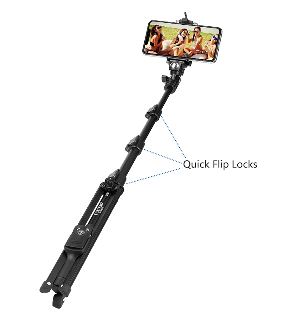 Ultra extendable at 51",hardly tell it is a selfie picture:Quick flip locks–No twisting to lock-Wobble free selfies-Toughest material,durable / non-slip sure grip rubber handle.