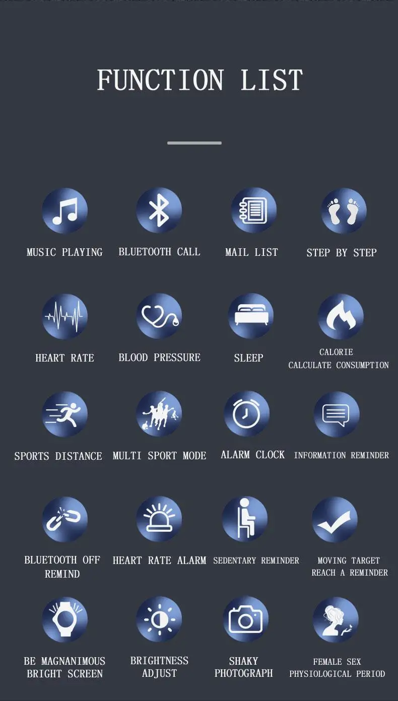 *Main features: Music, dial-up/incoming calls, call logs, contacts *Basic functions: stopwatch, countdown, find the phone *Health monitoring: exercise patterns, sleep, heart rate, blood pressure *Reminder function: alarm clock, SMS/app message, Bluetooth disconnected alarm, heart rate alarm, sitting, sports goal achievement reminder *General functions: binding device, wear detection, bright screen of wrist turn, brightness adjustment, lock screen duration, main interface style setting, low-power mode, no-disturb mode *Other features: photo taking, female function, reset password, device broadcast, switch Settings