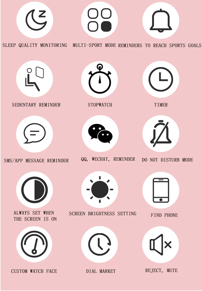 Local music playback/Bluetooth music control, Bluetooth playback, dialing/incoming calls, call history, contacts, custom dials, stopwatches, countdowns, lookup phones, alarm clock reminders, SMS/app message reminders, Bluetooth disconnect reminders, heart rate alarm reminders , Sedentary reminder, reminder to reach sports goal, turn the wrist to brighten the screen, adjust brightness, lock screen duration, main interface style setting, low power consumption mode, do not disturb mode, take pictures, female function (only remember menstrual period, pregnancy period, pregnancy period) , Baoma period), reset password, device broadcast, switch settings