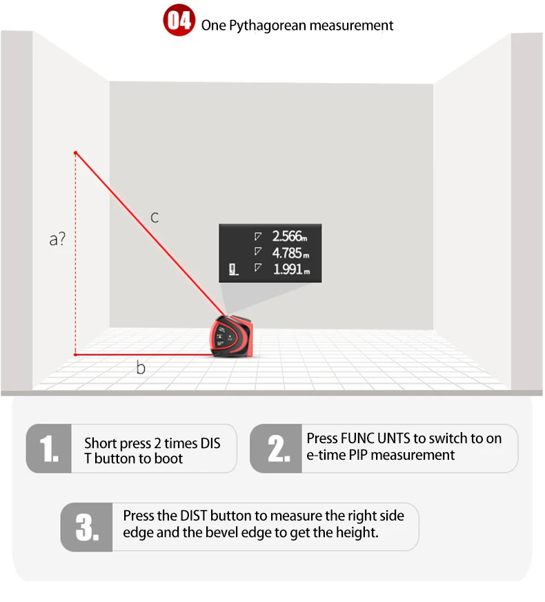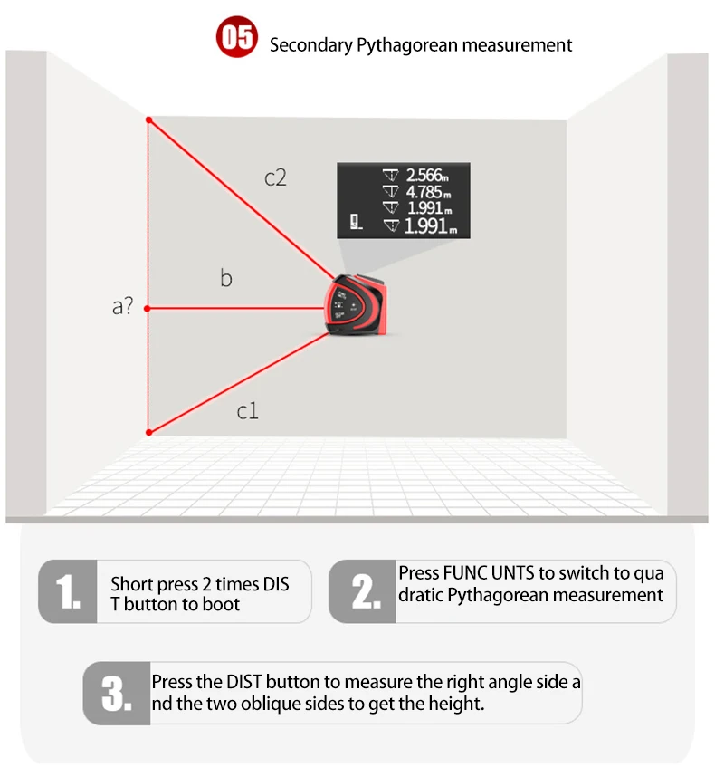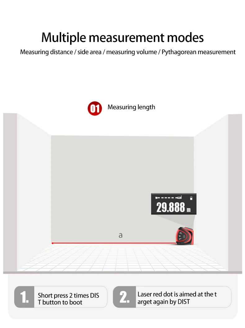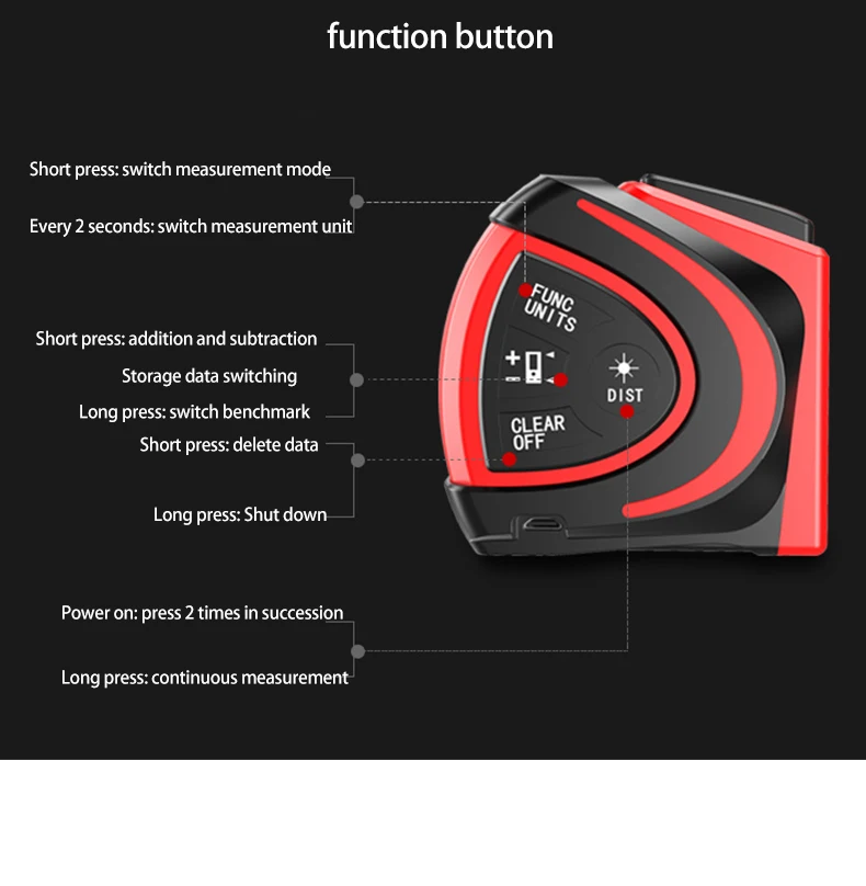 Simple button operation makes it easy to realize multiple measurements and calculations. HD LED backlight digital display supports better visibility in low-light conditions. Quickly press twice Clear/Off button to rotate the display, easier to read.