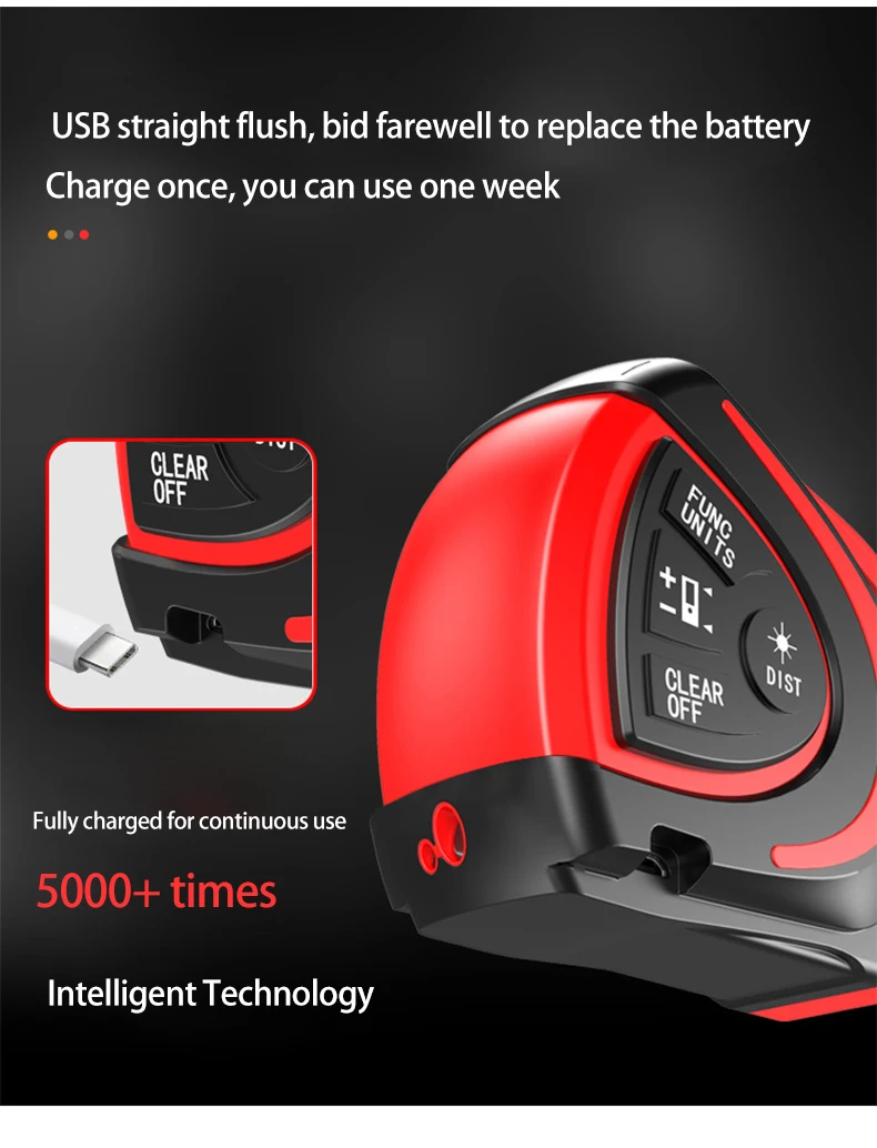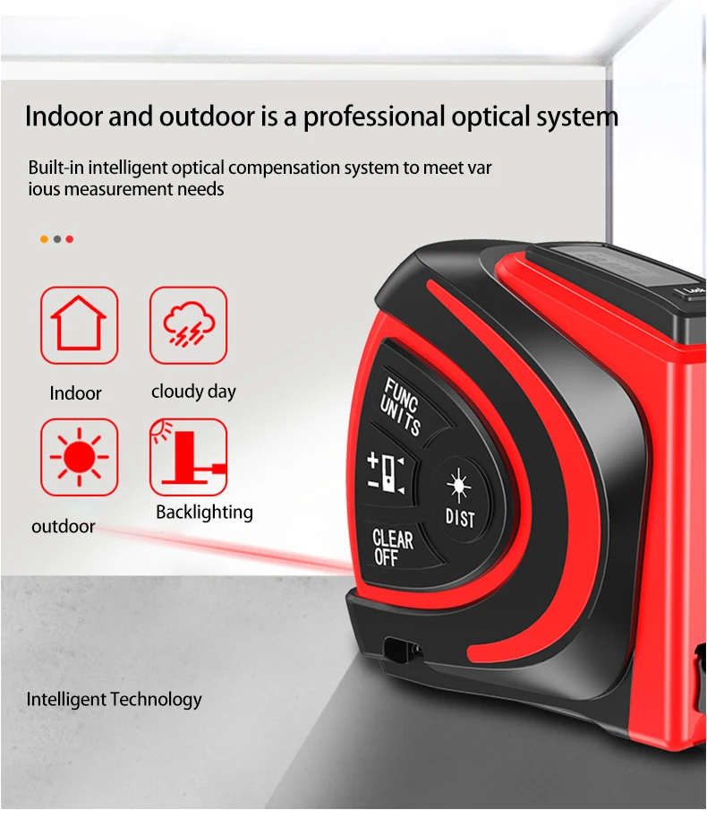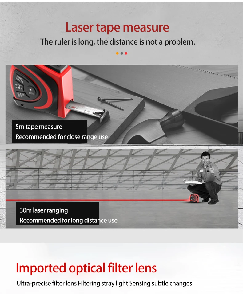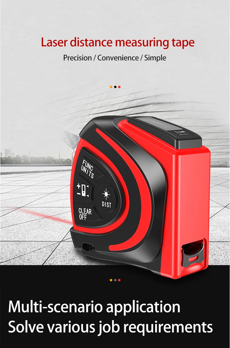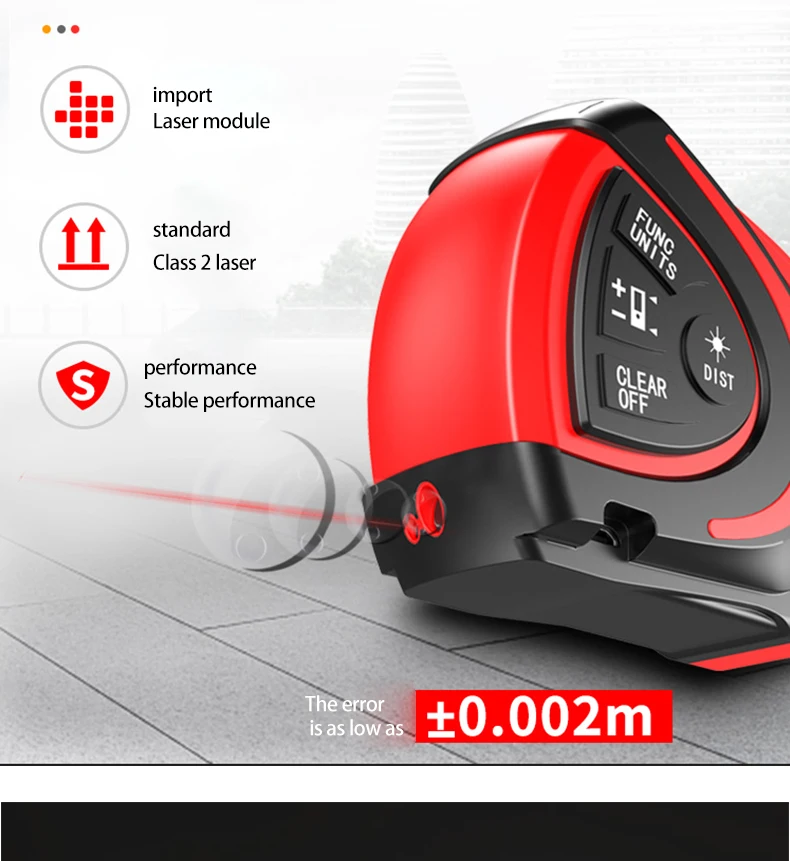 A multifunctional measuring tool combining a 98 Ft laser measurer with a 16 Ft tape measure. 3 kinds of unit: m/in/ft.The display will show date of laser measurement, Date of steel tape measurement won't be shown.