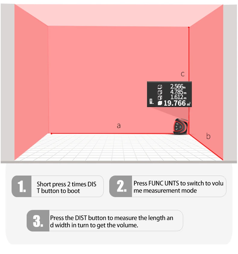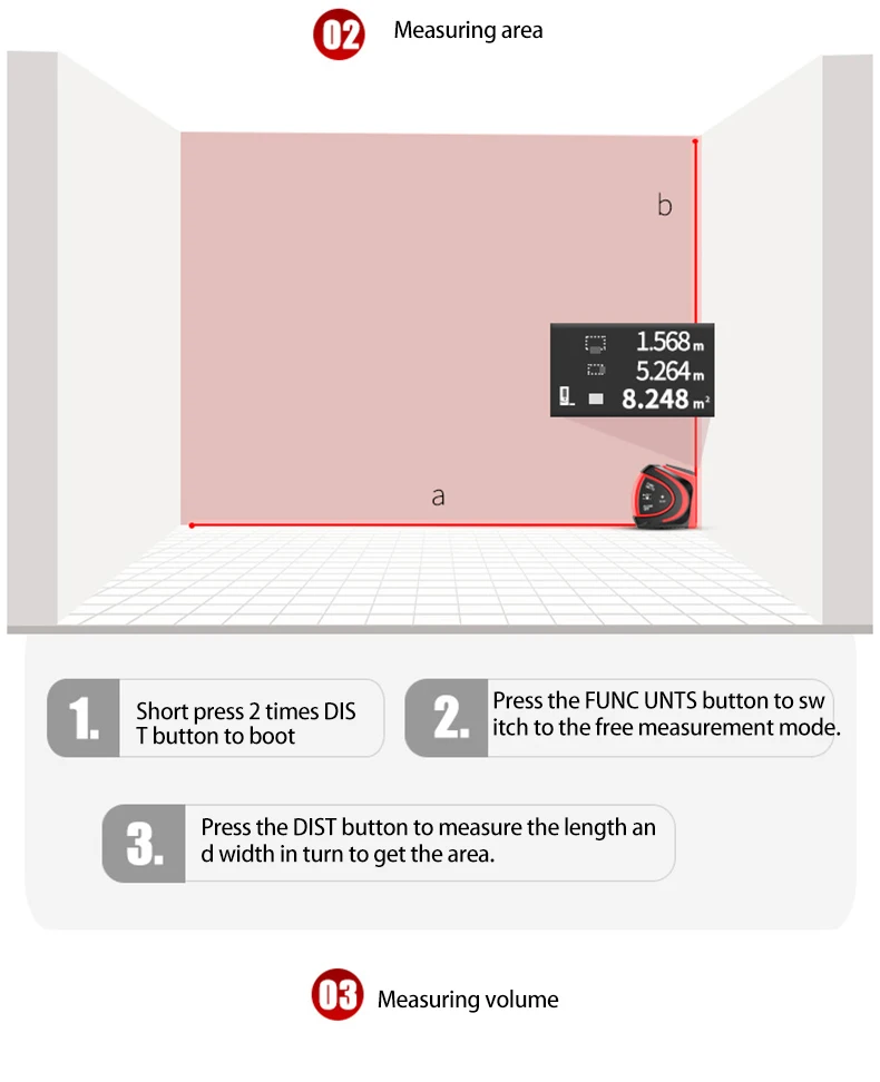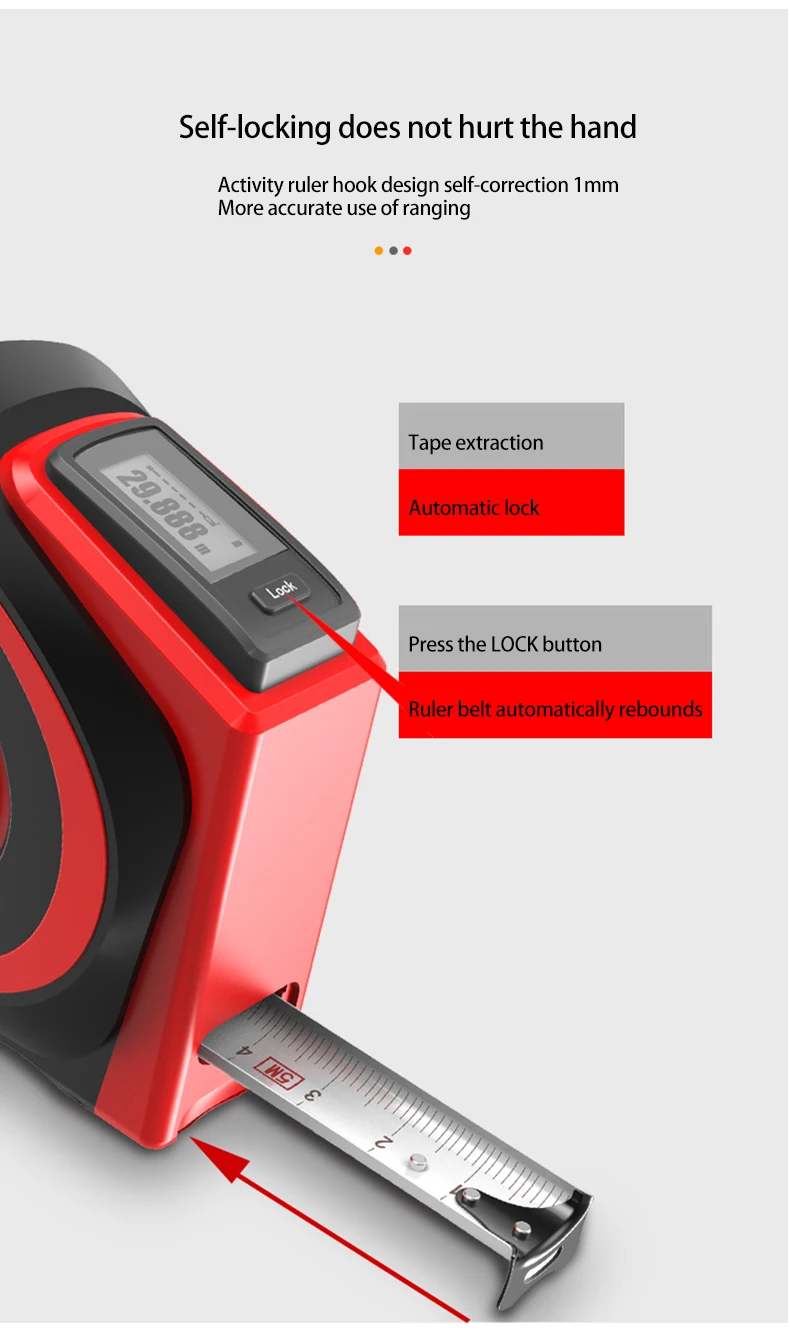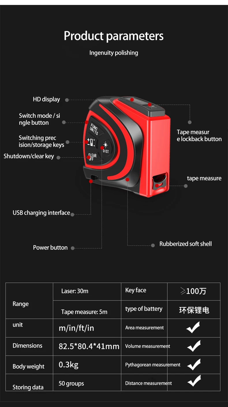 A multifunctional measuring tool combining a 98 Ft laser measurer with a 16 Ft tape measure. 3 kinds of unit: m/in/ft.The display will show date of laser measurement, Date of steel tape measurement won't be shown.